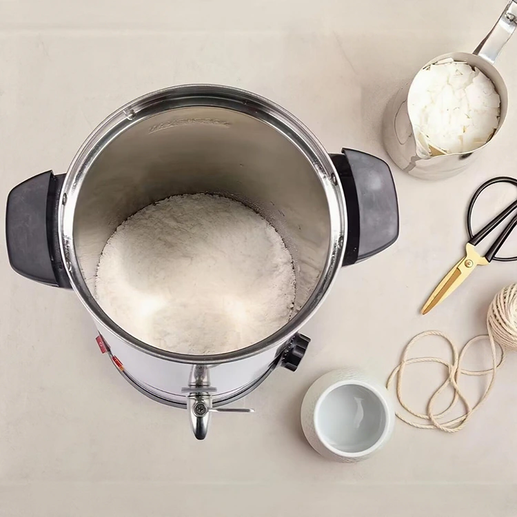 Nanjing FNAT on Hiina päritolu tehas, mis on spetsialiseerunud küünalde toorainete tootmisele. Meie professionaalsed vahasulatusseadmed on mõeldud eranditult vaha sulatamiseks, valmistatud toidukvaliteediga 304 roostevabast terasest mitme võimsusega (5L, 8L, 10L, 12L, 15L, 25L, 35L, 45L jne). Sellel on rahvusvahelised pistikuvõimalused, ummistumatu ja hõlpsasti puhastatav vahakraan, temperatuuri reguleerimine, kahekihiline isolatsioon ja täielik šassii kolmemõõtmeline soojendus kiireks kiiruseks ja kõrge termilise efektiivsuse tagamiseks. Stabiilne kvaliteet, see ühendab professionaalsuse ja praktilisuse, sobib suuremahuliseks küünalde tootmiseks ja tööstuslikuks kasutamiseks.